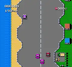 When the speed of the car is at least 100 mph, players are able to perform a jump. Cars are lost upon wrecking into either side of the road, plunging into water, or hitting an obstacle. The game continues until the player runs out of cars. Extra cars will be given during the game, except after 999,999 points are scored. Once this score is reached, a "survival of the fittest" mode will activate for the rest of the game, to the very last life.