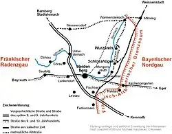 The size of the site suggest it had pan-regional significance. It lay on a wooded, domed hilltop whose view into the Weidenberg valley is obscured today, Weidenberger Tal, in the northern Upper Palatinate (Rauher Kulm) and to the Bocksleite opposite, a hill ridge over which a trade and military road ran in the late 8th and 9th centuries. This ran from Bamberg and the Upper Mainland into the Egerland.[5] Other historic roads ran from north to south into the interior of the Fichtel Mountains and from east to west towards Eger (now Cheb).[6]