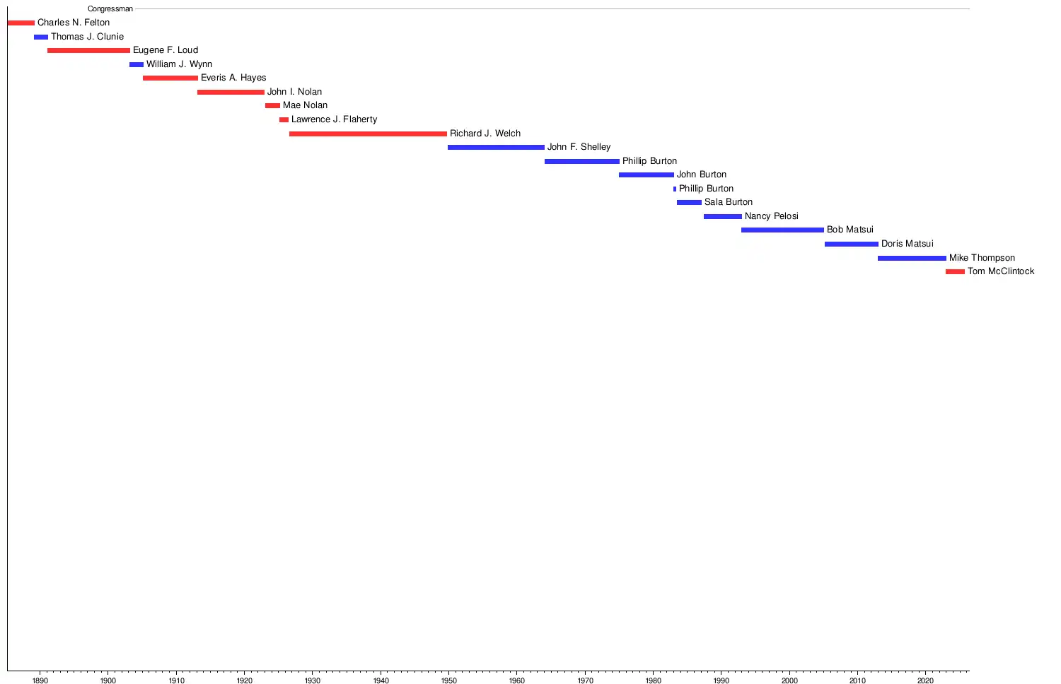 The following timeline depicts the progression of the representatives and their political affiliation at the time of assuming office.