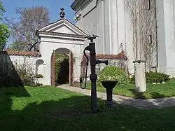 The facade was erected when the church with the main body had been already built. The designer of that late Baroque works could be a Roman architect Gaetano Chiaveri. The facade is triaxle – the central part is a little forward of and topped with a tympanum, enclosed in a pair of composite pilasters and columns. Here there are two architectural styles late Baroque and early Classicism. The first of them can be seen in the details and the second one in the central part and columns. In the side niches are set two wooden polychrome sculptures. The first shows Saint Benedict and the second one Saint Romuald.