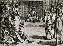 Almanzor shows the heads of the seven infantes, plus that of a faithful retainer, to their father Gonzalo Gustioz. Engraving by Otto Venius, seventeenth century.