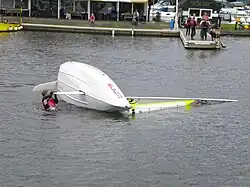Most small monohull sailboats can normally be righted by standing or pulling down on the centreboard, daggerboard (or bilgeboard in a scow) to lift the mast clear of the water. Depending on the design of the hull, the boat's righting moment will normally take effect once the mast is around 30 degrees from horizontal and help pull the boat vertical. Righting a catamaran that is lying on its side involves using a righting line fed over the upper hull. The crew stands on the lower hull and pulls back on the righting line. In small catamarans such as the Hobie 16 it is imperative that at least one crew member assumes this task as soon as possible as there is a chance that the boat will turtle and then become extremely difficult to recover without assistance.[6] Some monohulls and catamarans use a small flotation device mounted at the tip of the mast or mainsail to ensure that the craft cannot assume an inverted position, or at least that a fully inverted position is not stable (i.e. it would come to a position where the mast is lying on the surface of the water, which would be preferable to fully inverted).