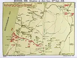 By early afternoon of 21 September, organised Yildirim Army Group resistance in the Judean Hills had ceased, most of the Ottoman Eighth Army had surrendered while the Seventh Army was retreating east down the Wadi el Fara road hoping to cross the Jordan River by the bridge at Jisr ed Damieh.[12][13]