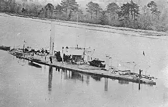 - ^ Millers Photographic History of the Civil War Vol 6 "The Navies". "In order to furnish efficient fighting-vessels that could thread the shallow streams and bayous along the shore, the construction of a dozen light-draft monitors was undertaken late in the war. They were to draw only seven feet of water, and to be a small edition of the original monitor, mounting one gun only. Through a miscalculation in the engineer's office, their displacement was wrongly estimated. They proved utter failures. All or nearly all of them were on the ways at the same time. When the first was launched, she proved not sufficiently buoyant to sustain her armor and guns, giving a very good imitation of a submarine when striking the water. To meet the demand for light-drafts–three on the James River–these monitors were lightened by removing their turrets, as has been done in the case of the one in the picture. The naval reports record every form of disparagement of these vessels, except the profanity they evoked from officers and men."