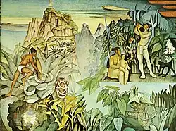 The former gaming room in the main hall came to be called the Salón de los Murales. The Spanish Republican artist Josep Renau painted a mural there of "La Hispanidad" a history of the Iberian Peninsula from the time of the Phoenicians to the conquest of America. The other side of the room held a 1965 mural by José Reyes Meza that depicted indigenous culture in the Valley of Mexico. The hall also had a mural of The Apocalypse by Jorge Flores, a disciple of David Alfaro Siqueiros.[11] Renau's Mural de la conformacion hispanica, painted with his wife Manuela Ballester(es), depicted the conquest and colonization of America by the Spanish and covered more than 300 square metres (3,200 sq ft).[16] The walls of the rooms and corridors also held the work of David Alfaro Siqueiros, Dr. Atl, Benito Messeguer, Jorge González Camarena, Francisco Icaza, Victor Moscoso and others.[17][18]