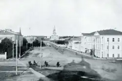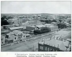 The Catherine Cathedral played a vital social role. It hosted numerous weddings, with 1,173 marriages from 1900 to 1919.[70] Many notable residents were married or memorialized there. Notable weddings included Englishman John Thomas Wilkinson to D. F. Ponomaryova, daughter of a collegiate secretary, in 1872, and collegiate secretary P. M. Vologodsky to A. I. Neyberg, daughter of a state councillor, in 1875. Prominent funerals included collegiate councillor V. M. Malakov, state councillors A. I. Krasnopevtsev and A. F. Chubarkov, titular councillor A. I. Sevastyanov, and women's gymnasium head E. I. Kuk. Besides the Ural Mining Battalion's banner, the cathedral housed military regalia and charters of prominent Uralians. Its enclosure contained graves of notable citizens, including M. I. Bashmakov, a key figure in suppressing the Pugachev's Rebellion, and Archimandrite Sophronius of Hilandar.[71][72][42][web 2] At the turn of the 19th–20th centuries, one of Yekaterinburg's first electric lanterns appeared near the cathedral.[73]