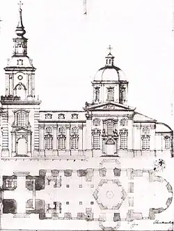 Before the old church's demolition, the Mining Administration commissioned a new stone cathedral design from Saint Petersburg architect Johann Werner Müller. His 1743 design in the Western European Baroque style envisioned a three-altar church with a three-tiered square bell tower and a hexagonal dome over the central section. Müller placed the side altars within the central nave, unlike the standard Russian church architecture of the time, which typically added side altars as separate volumes.[4][11][17][18][web 4]