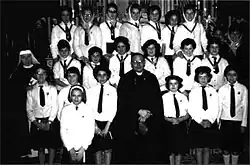 All these associations were affiliated with the Rayon sportif féminin, founded in 1919 by the Daughters of Charity of Saint Vincent de Paul.[N 6][3] The regional overseas committees of the Rayon sportif féminin were created in 1937,[3] on the initiative of Marie-Thérèse Eyquem. In addition to gymnastics, the sports practised included basketball, volleyball, prisonball, swimming, canoeing, and cycling.[3] In each diocese, the chaplain provided the instructors with spiritual training – which remained the prerogative of the clergy and directors of the associations. The Rayon sportif féminin insisted on leaders and instructors being practising Catholics:
