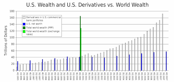 The graph above shows the total notional value of derivatives relative to US wealth measures. It is important to note for the casual observer that, in many cases, notional values of derivatives carry little meaning. Often the parties cannot easily agree on terms to close a derivative contract. The common solution has been to create an equal and opposite contract, often with a different party, in order to net payments (Derivatives market#Netting), thus eliminating all but the counterparty risk of the contract, but doubling the nominal value of outstanding contracts.
