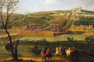 The works at Marly were begun in the spring of 1679, on 22 May,[2] before Louis had moved his court permanently to Versailles. The king was looking for a retreat on well-wooded royal lands between Versailles and Saint-Germain-en-Laye that were well-watered[3] and provided a grand view. Marly was chosen.[4]