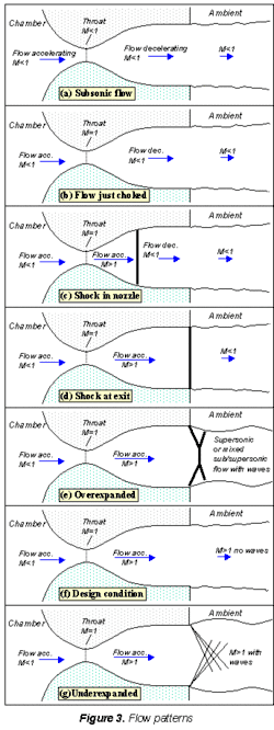 Finally, lowering the back-pressure even further creates a new imbalance between the exit and back pressures (exit pressure greater than back pressure), figure 1g. In this situation (called 'underexpanded') expansion waves (that produce gradual turning perpendicular to the axial flow and acceleration in the jet) form at the nozzle exit, initially turning the flow at the jet edges outward in a plume and setting up a different type of complex wave pattern.[13]