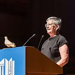 Christine is the President of the International Federation of Library Associations and Institutions (IFLA) from 2019 to 2021, leading the library field under the theme "Let's work together".[4][5] Her mandate takes the results of projects as the IFLA Global Vision where librarians around the world created a bottom-up strategy[6] where one of the highlights and opportunities are related to focus on our communities and work more collaborative and develop strong partnerships.[7] She received her presidency from Glòria Pérez-Salmeron in Athens,[8] at the 85th World Library and Information Conference[5] and in her acceptance speech she mentioned the access to information from indigenous languages[9] and to restructure IFLA to achieve the Strategic Framework (2019–2024).