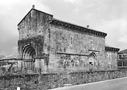 The longitudinal plan of the church is composed of a single-nave and rectangular presbytery (which is lower and narrower), with northern sacristy and tiled roof.[1] Its principal facade terminates in the gabled roof and includes a central portico on the ground floor, consisting of four columns supporting an architrave with decorative zoomorphic motifs.[1] The columns of this portico are decorated with monkeys, human figures (interpreted as the Virgin Mary and Angel Gabriel), entwined serpents and eagles with their beaks within a cornucopia. The capitals are decorated in vegetal forms or zoomorphic patterns.[1] The first archivolt has a rosetta and rings, the second monkeys, the third monoliths and human figures.[1] The tympanum includes a central figure of Christ secured by two angels.[1] These images imply a level of universal surrender of the human forms by figures within the archivolt, while others suggest that the figures represent the figures of the Apostles of Christ, who were depicted as being represented by the types of images.[1] Also problematic in this interpretation are the two figures of Mary and angel Gabriel (normally associated with the Annunciation) and who Lourenço Alves interprets as monks.[1]