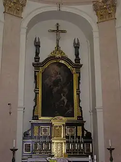 The main Neo-Renaissance altar is the work of Antonin Baum and dates to 1879, when the church interior was restored and modified. In its center is a picture of an earlier period, the work of Ignác Raab in 1760, divided into two zones. At the top is the Virgin Mary as the Queen of Heaven with angels and at the bottom are patron saints invoked against plague epidemics: St. Roch, Saint Sebastian, and Saint Rosalia. The background of the image depicts the horror and destruction caused by the plague.