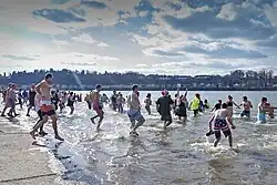 Participants jump in the Susquehanna River during the annual Penguin Plunge to raise money for the Humane Society of Harrisburg Area, January 2020