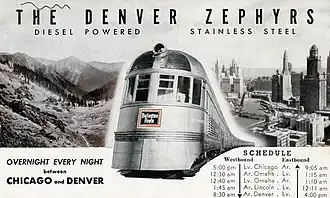 At the same time the Chicago, Burlington and Quincy Railroad, commonly known as the Burlington, had ordered two streamlined 10-car trainsets of its own: the Denver Zephyr, built by the Budd Company and modeled on the Pioneer Zephyr, the first articulated streamliner in the United States. While the City of Denver beat the Denver Zephyr into service, making its first run between Chicago and Denver on June 18, 1936, on May 31 the Burlington had deployed two of its existing trainsets, the original Zephyr and the Mark Twain Zephyr, on its own route between Chicago and Denver as the Advance Denver Zephyr.[5][6] While as fast as the City of Denver, the three-car sets in no way compared to amenities aboard the 12-car Union Pacific streamliners,[7] which included the "Frontier Shack" tavern, a dining-cocktail lounge, and a sleeper-lounge-observation car.[8] The Burlington's new equipment would arrive in November. The two services operated on nearly-identical schedules.[7] Fulfilling its early promise, the City of Denver traveled at an average speed of 66 miles per hour (106 km/h), the fastest of the Union Pacific's streamliners.[9][note 1]