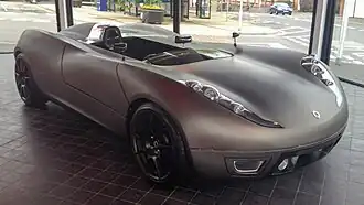 The production model debuted at the 2015 Coventry Motofest.[5] The bodywork is made of a combination of aluminium and carbon fibre. It includes flip up aeroscreen, detachable steering wheel and removable tonneau cover.[1]