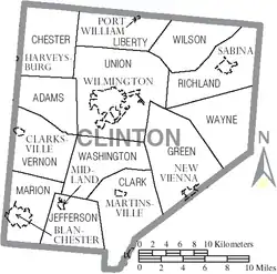 Clinton County is a county located in the U.S. state of Ohio. As of the 2020 United States census, the population was 42,018.[2] Its county seat and largest city is Wilmington.[3] The county is named for former U.S. Vice President George Clinton.[4] Clinton County comprises the Wilmington, Ohio Micropolitan Statistical Area, which is also included in the Cincinnati-Wilmington-Maysville, OH-KY-IN Combined Statistical Area.
