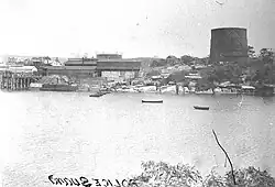 The Carrington coal port used twelve hydraulic cranes powered by water under pressure supplied from a pumphouse nearby.[105] There were also three steam cranes, which had been relocated from Queens Wharf.[60] In 1890, this government-operated facility was capable of loading a total of 12,000 tons per day. The first electric cranes were commissioned at the Basin, in 1916, but at the end of that year needed to be shutdown for a short time, while the power supply was improved. By mid 1917, there were six electric cranes there.[106][107][108]