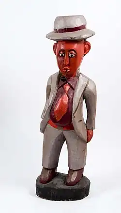 Colon statues, a term derived from the French statues colon ("colon" is the French noun for a colonist), are a genre of wooden figurative sculpture within African art which originated during the colonial period.[1] The statues commonly depict European colonial officials such as civil servants, doctors, soldiers or technicians or Europeanised middle-class Africans.[1] They are often characterised by recurrent decorative motifs, such as pith helmets, suits, official uniforms or tobacco pipes,[2] and are painted in bright or glossy colours with vegetable-based paints.