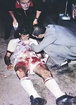 Combin was kicked in the face by Poletti and later had his nose and cheekbone broken by the elbow of Ramón Aguirre Suárez. Bloodied and broken, Combin was asked to return to the pitch by the referee but fainted. While unconscious, Combin was arrested by Argentine police on a charge of draft dodging, having not undertaken military service in the country. The player was forced to spend a night in the cells, eventually being released after explaining he had fulfilled national service requirements as a French citizen.[61] Estudiantes won the game 2–1 but Milan took the title on aggregate.[61][64][65][66]