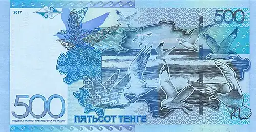 Reverse of a 500 KZT banknote, which belongs to a class of works not normally protected by the copyright law of Kazakhstan[a]