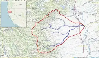 Cottonwood Creek is a major stream and tributary of the Sacramento River in Northern California. About 68 miles (109 km) long measured to its uppermost tributaries, the creek drains a large rural area bounded by the crest of the Coast Ranges, traversing the northwestern Sacramento Valley before emptying into the Sacramento River near the town of Cottonwood. It defines the boundary of Shasta and Tehama counties for its entire length. Because Cottonwood Creek is the largest undammed tributary of the Sacramento River, it is known for its Chinook salmon and steelhead runs.[2]