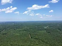 Three hiking trails and one vehicle access trail lead to the summit of Crowders Mountain, and from the summit it is possible on a clear day to see the skyscrapers of Charlotte, North Carolina to the east.