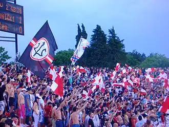 Since its foundation, Radnički has been a magnet for the audience in Kragujevac and its surroundings. During the Kingdom of Yugoslavia (1918–1943), the followers of Kragujevac were one of the most numerous and loyal group of supporters, following their team wherever they played. They were recognizable by the red caps they wore. Trips to away games were organized, usually by train. The first "fan train" started on 29 July, in 1934. About 600 Radnički Kragujevac fans travelled to Belgrade for a qualification match for the national championship against BASK. After Belgrade, the "fan train" became a tradition, and the fans traveling to away games to Zagreb, Sarajevo, Split, Novi Sad, Niš, Skoplje and other cities.[1] At the home games, against teams like Rapid Wien, Olympique Marseille, Ferencváros Budapest and Honvéd Budapest, up to 10,000 fans came to support the club. The support continued after the Second World War. In 1946, Radnički Kragujevac played against Red Star Belgrade for promotion to the Yugoslav First League. At the game there were too many fans at the former City Stadium, which was too small to accommodate all visitors and supporters of Radnički Kragujevac. This situation prompted the city and club to build a new stadium. The first game which was played on the new Čika Dača Stadium, was in 1957 between Radnički Kragujevac and Partizan Belgrade in front of 30,000 jubilant fans.[2]