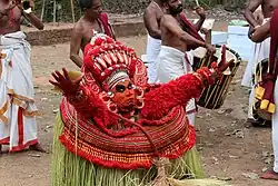 Theyyam is a ritual performance art form[12] that depict the cultural heritage of North Malabar, especially of ancient Kolathunad. Theyyam depicts Shiva bhutaganas, Kali and other deities and cultural heroes. The drama is enacted based on ancient stories and the language used is "Tottam pattu", a primitive form of Malayalam. Theyyam shows the Buddhist influence from centuries ago. Theyyam is usually held from October to May every year. The colour of Theyyam is typically red. Velan is described in the Sangam literature 500 CE. It could have been a tribal ritual art which evolved under Buddhism and the Brahminic revival of Hinduism. This art form is addressed as "Kaliyattom" North of Pazhayangadi Puzha, Kannur, as "Theyyam" South of the river and as "Thira" around Thalassery.[13]