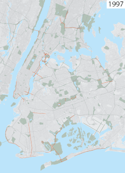 Bike lanes on major bridges were created, refurbished, or improved, and the New York City Department of Parks and Recreation, in partnership with other agencies, created the Manhattan Waterfront Greenway, Brooklyn-Queens Greenway and other bikeways.[7] The Department of Parks and Recreation added a vendor program to provide "hop on, hop off" bicycle rental services across various city parks.[14] The linked network of bicycle rentals is facilitated through concessions in Central Park, Riverside South, West Harlem Piers Park, and the Battery.[15]