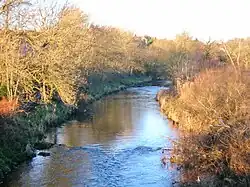 The Rye Water has its source among the nearby high hills. The most interesting spot is that about which the world has been singing for centuries - the spot where it was crossed by a ford below Ryefield House. Before the erection of any bridge at Drakemire, the fording of the stream had occasioned much fun and banter, as shown by the many traditionary verses of the light and beautiful song "Comin' Thro' the Rye" that commemorates the primitive scene:[4][5]-