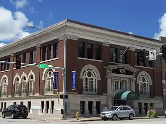 The period of significance for the historic district is from 1850, when the present St. Anthony's Church was begun, until 1968 when the present Davenport Public Library was completed.[2] During the intervening years buildings were constructed for civic, commercial, light industrial, entertainment, multiple dwelling, and fraternal uses. By the 1890s the city had become the financial center of the region and the state.[6] The district was the location for the city's financial institutions, including the city's tallest building, Davenport Bank and Trust (1927).[7] Several hotels, including the Davenport Hotel (1907), were built in the district to serve the main train stations and Hotel Blackhawk (1914, 1920) was a convention-oriented hotel. In addition to the county courthouse, the district also includes Davenport City Hall (1895), Central Fire Station (1901), and the United States Courthouse (1933). Light industrial uses included cigar manufacturing, wood planning, and carriage and plow manufacturing before those buildings were converted into other uses. Initially, commerce focused on dry goods, groceries, specialty stores, and wholesale goods before fashionable department stores were built, including the J.H.C. Petersen's Sons' Store (1892) and M.L. Parker (1922). Multiple theaters were located in the district, but only two remain the Capital Theatre (1922) and the former RKO Orpheum (1931). Of the apartment buildings constructed downtown, the Dorothea (1910) was one of the few buildings constructed by a woman.[2]