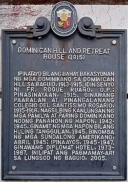 In 1911, American friars of the Order of Preachers (commonly known as "Dominican Order") along with a few Spanish members made plans for the construction of a vacation house for them and the nuns of their order in Baguio. One of the members of the order, Fr. Roque Ruaño, O.P., the same architect of the main building of the current campus of the University of Santo Tomas, designed the building. A 17-hectare hill property was acquired from Americans who reside in Baguio and construction is said to have started in 1913 and was supervised by Ruano himself. It was then inaugurated in May 1915. To take advantage of tax exemptions, the order set up a seminary named Colegio del Santissimo Rosario[3] in June 1915 but due to the very small enrollment, the school closed two years later and the building was reverted to its original use. The hill where the building stands was christened as "Dominican Hill".