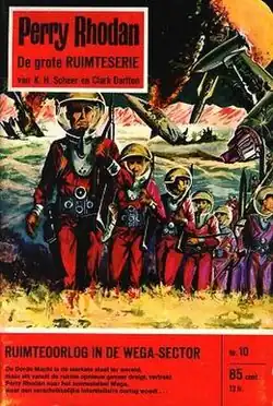 ‘Perry Rhodan, der Erbe des Universums’ (Eng: ‘The Heir to the Universe’, though the American/British editions instead used the subtitle 'Peacelord of the Universe') was created by German science fiction authors K. H. Scheer and Walter Ernsting and launched in 1961 by German publishing house Arthur Moewig Verlag (now Pabel-Moewig Verlag). Originally planned as a 30 to 50 volume series, it has been published continuously every week since, celebrating the 3000th issue in 2019.[5][6] Written by an ever-changing team of authors, many of whom, however, remained with the series for decades or life, Perry Rhodan is issued in weekly novella-size installments in the traditional German Heftroman (pulp booklet) format. Unlike most German Heftromane, Perry Rhodan consists not of unconnected novels but is a series with a continuous, increasingly complex plotline, with frequent back references to events. In addition to its original Heftroman form, the series now also appears in hardcovers, paperbacks, e-books, comics and audiobooks.