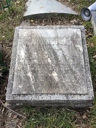 "Impoverished and lamented by the proletariat as a whole",[29] the poet died at his one-room home on Bucharest's Ștefan cel Mare Highway shortly after his 46th birthday (on October 17, 1904, in New Style dates).[21] Though writer Constantin Țoiu recalled in 1997 that Neculuță had died of lung disease in Colentina Hospital,[30] he had in fact suffered a fatal heart attack.[31] According to Kiss, his cardiac condition was owed to physical exhaustion from "continuous strenuous work".[18] An inventory carried out on the day of Neculuță's death records that he only owned an iron bed and mattress, a table, a coat hanger, a coffer filled with books, one shirt, plates, and some other items. His definitive manuscript, which he kept under the mattress, went unreported.[32] The funeral cortege, comprising workers, was initially scheduled to walk down Calea Victoriei, and thus parade in front of the Royal Mansion. Romanian Police intervened to stop this from occurring, and also confiscated red flags carried by participants.[33] Two hundred black ribbons were distributed instead. This count was reported to Frimu, who openly rejoiced: "Well then, that there's two hundred friends of our cause! So then, we're growing, we're getting stronger! The future is ours!"[34] Neculuță was buried in Bellu Cemetery, originally in a crypt designed by Filip Marin.[35] Marin was later buried in that same spot, alongside his friend.[19]