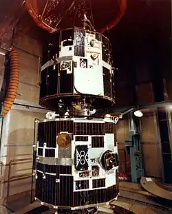 Dynamics Explorer 1 (DE-1 or Explorer 62) was a NASA high-altitude mission. It was launched on 3 August 1981, and terminated on 28 February 1991. It consisted of two satellites, DE-1 and DE-2, whose purpose was to investigate the interactions between plasmas in the magnetosphere and those in the ionosphere. The two satellites were launched together into polar coplanar orbits, which allowed them to simultaneously observe the upper and lower parts of the atmosphere.[2]