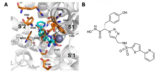Figure 1. A. Crystal structure of ERAP2 co-crystallized with hydroxamic acid triazole in the active site. Adapted and recreated from PDB code 7NSK.[30] B. 2D chemical structure of co-crystallized compound.