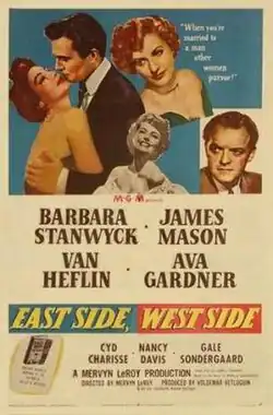 East Side, West Side is a 1949 American crime film, starring Barbara Stanwyck, James Mason, Van Heflin, and Ava Gardner. While frequently termed a melodrama or women's film, it also has been described as a film noir[2][3] and "urban noir."[4]