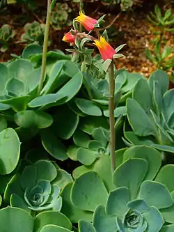 Echeveria gibbiflora is a large species of Echeveria,[2][1] producing rosettes of 15 leaves, a tall flowering stem up to 1 metre (3 ft 3 in) in height, and an average of 160 flower buds.[5] The red, tubular flowers are about 2.5 centimetres (0.98 in) long with 10 stamens and 5 styles.[5][6] It flowers between September and January.[2][5] The dry fruits each produce approximately 200 small seeds.[5]