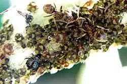 Another mechanism of facilitation is a reduced risk of being eaten. Nurse plants, for example, not only reduce abiotic stress, but may also physically impede herbivory of seedlings growing under them.[3] In both terrestrial and marine environments, herbivory of palatable species is reduced when they occur with unpalatable species.[1][3][4] These "associational refuges" may occur when unpalatable species physically shield the palatable species, or when herbivores are "confused" by the inhibitory cues of the unpalatable species.[1][3] Herbivory can also reduce predation of the herbivore, as in the case of the red-ridged clinging crab (Mithrax forceps) along the North Carolina, US, coastline.[12] This crab species takes refuge in the branches of the compact ivory bush coral (Oculina arbuscula) and feeds on seaweed in the vicinity of the coral. The reduced competition with seaweed enhances coral growth, which in turn provides more refuge for the crab. A similar case is that of the interaction between swollen-thorn acacia trees (Acacia spp.) and certain ants (Pseudomyrmex spp.) in Central America.[2] The acacia provides nourishment and protection (inside hollow thorns) to the ant in return for defense against herbivores. In contrast, a different type of facilitation between ants and sap-feeding insects may increase plant predation.[2] By consuming sap, plant pests such as aphids produce a sugar-rich waste product called honeydew, which is consumed by ants in exchange for protection of the sap-feeders against predation.