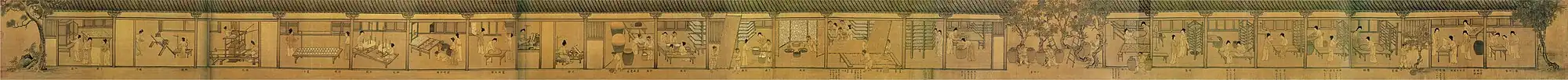 Rural families that sold a large agricultural surplus to the market not only could afford to buy more charcoal, tea, oil, and wine, but they could also amass enough funds to establish secondary means of production for generating more wealth.[24] Besides necessary agricultural foodstuffs, farming families could often produce wine, charcoal, paper, textiles, and other goods they sold through brokers.[24] Farmers in Suzhou often specialized in raising bombyx mori to produce silk wares, while in Fujian, Sichuan, and Guangdong, farmers often grew sugarcane.[24] In order to ensure the prosperity of rural areas, technical applications for public works projects and improved agricultural techniques were essential. The vast irrigation system of China had to be furnished with multitudes of wheelwrights mass-producing standardized waterwheels and square-pallet chain pumps that could lift water from lower planes to higher irrigation planes.[25]