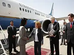 Eka Tkeshelashvili (center) greeting Condoleezza Rice in Georgia, August 2008.