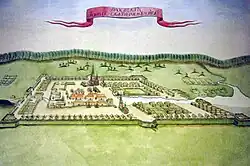 To better project military power in the area, construction of a new fortress around the Yekaterinburg settlement began on 3 March 1723, starting with the establishment of a barracks. Work began on damming the Iset river that same year, the majority of which was carried out by the 38th Tobolsk Infantry Regiment.[2][3][4]