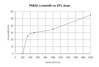 • A 20 nm resolution had also been demonstrated using a 3 nm 100 keV electron beam and PMMA resist.[36] 20 nm unexposed gaps between exposed lines showed inadvertent exposure by secondary electrons.
