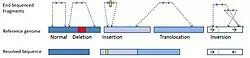 Inversions and translocations are relatively easy to detect by an invalid pair of sequenced-end. For instance, a translocation can be detected if the paired-ends are mapped onto different chromosomes on the reference genome.[4][5] Inversion can be detected by divergent orientation of the reads, where the insert will have two plus-end or two minus-end.