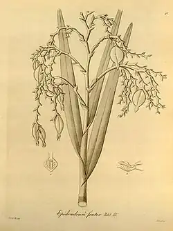 E. frutex Rchb.f. (1855) is closely related to E. frigidum Lind. (1855),[2] growing terrestrially in "open sphagnum uplands".[3] The tall sympodial plants grow from 3/4 to 5 m tall. As is typical of the subgenus E. subg. Epidendrum, the stems are covered from the base with distichous, tubular, leaf-bearing sheaths. The narrow leathery leaves of E. frutex can grow more than 2 dm long. The terminal inflorescence is a distichous (not secund) compound panicle bearing numerous small, fleshy yellow to green to brown flowers. The triangular sepals are no longer than 6 mm. The linear petals are slightly shorter than the sepals. The lip is adnate to the column to its apex, heart-shaped where it diverges from the column, broader than it is long, and not divided into lobes. A linear keel runs down the center of the lip.