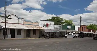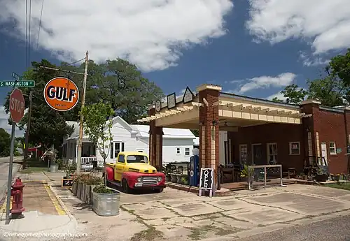 A former precinct courthouse, sits in the town square with extra wide 100-foot (30 m) curbed streets on its borders as specified in the original 1850 plat. Bounded by Main, Washington, Live Oak and Fayette streets the town square is the focus of commercial development. The remainder of the town is primarily residential. Typical commercial construction is wood frame block buildings many featuring false front parapets and awnings. Residential construction is typically modest single family homes on generous lots.[2]