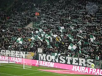 The fans have friendships with fans of Rapid Wien[7] and Panathinaikos, and as all three play in Green the alliance is nicknamed the "Green Brothers". They also have friendly relations in Hungary with fans of Zalaegerszeg and in Poland with Śląsk Wrocław and Bałtyk Gdynia.
