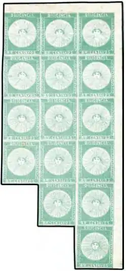 The Ferrer block is a corner block of 15 of the 80 centésimos green 1856 'Diligencia' (Suns) postage stamps, and is regarded by many philatelists as the most important item of Uruguayan philately. Fred Melville, speaking philatelically, called it "one of the seven wonders of the world".[1] It is the largest known multiple of this issue of which only a few blocks are known to exist. Most of the plating information about this issue has been derived from this one block.